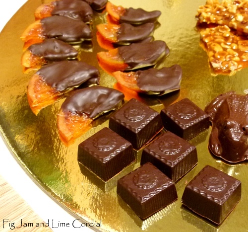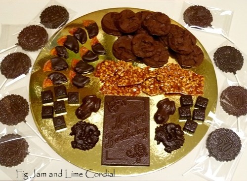 I recognised the cake board immediately! I love your blue plate. How good of you to make this variety of chocolates while suffering a lurgy. This is a very special gift and very generous of you. I would like the orange segments and Pete’s praline xx