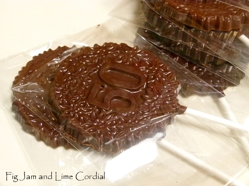 …nine chocolate “50” lollipops, six in the feuilletine blend and the remainder in dark…