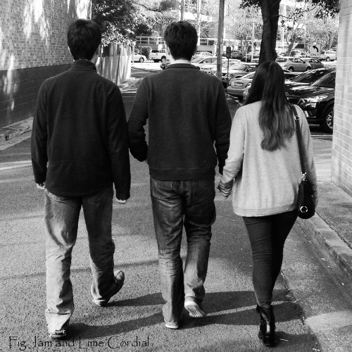 On Sunday, the sun came out to brighten a calm, glorious winter’s day. We went to lunch with my folks, and I took this photo of the kids as we were walking back to the car. My trailing behind photos have always been of our two (the previous ones are here and here), but now there are three. The adorable Monkey Girl joined us for lunch – we love her to bits…