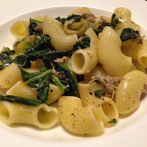 To a large pot of well salted boiling water, we added the roughly chopped raab and the sliced green portion of a small perennial leek. The water was then brought back to the boil and the dried pasta added. As it cooked, we fried up the leftover confit duck rillette (including all the fat) in a little butter with sliced garlic, chilli flakes and the chopped white portion of the leek. These were cooked gently (so that the garlic didn’t brown), and then the drained pasta and greens were added to the pot. Finally, a little of the boiling water was added and the dish was seasoned to taste.