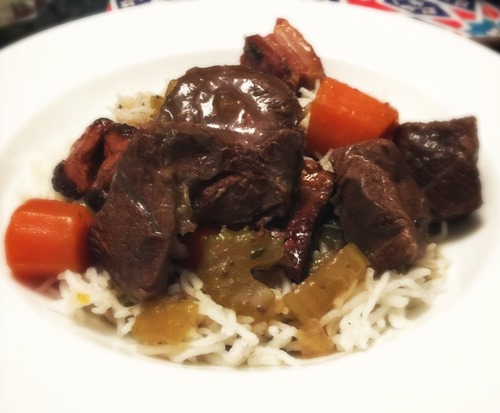 We combined two large pieces with fatty speck offcuts to add unctuousness to the delicious lean meat. After three hours of slow braising in the oven, it was meltingly tender and not at all gamey…