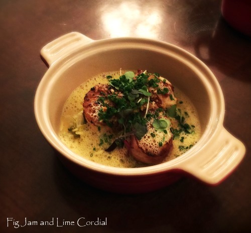 Pete and I weren’t particularly hungry, so we shared a few entrees. The Seared Panchetta Rolled Scallops with Leek Fondue and Saffron Emulsion ($19) was sublime…