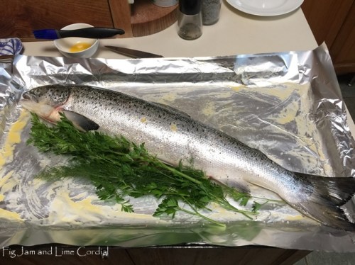…was a fresh Australian salmon. This large 70cm fish cost just $31 from Costco. We roasted it very simply, stuffed with fresh garden herbs, and seasoned with butter, salt and freshly ground black pepper…