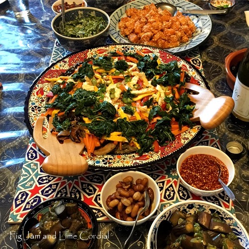 Our final dinner for the year was based around Korean flavours. After much googling, Pete decided that the main dish would be a vegetarian Japchae – sweet potato noodles topped with assorted mushrooms, garden greens, carrots, eggs and spring onions. This was accompanied by a variety of side dishes, including purslane salad, deep fried sweet potato and steamed eggplant.