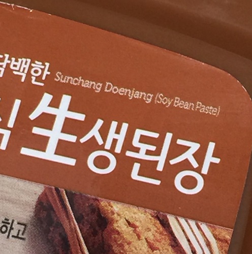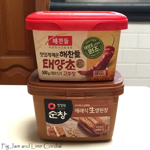 You’ll need to track down a tub each of Korean chilli paste and soy bean paste. I’ve taken photos to make identifying them a bit easier…