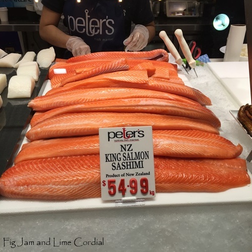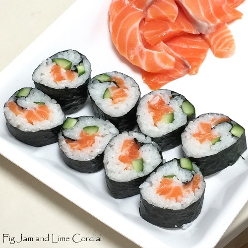 We bought half a kilo of King Salmon sashimi, which Pen and I turned into three large plates of sushi…