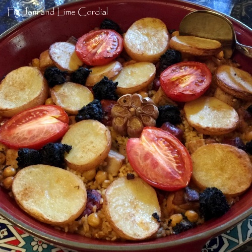 …is arroz al horno (rice in the oven). Our Spanish friend Emma emailed us her recipe, and it worked brilliantly. That’s Ali’s garlic in the middle and the burnt looking bits are morcilla (Spanish blood sausage)…