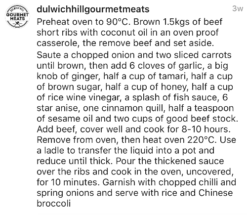 Last month, the lovely Yiota from Dulwich Hill Gourmet Meats gave me her recipe for beef short ribs. It sounded amazing, with the ribs slow cooking in a low oven for 8 – 10 hours. Here’s her version, in case you’d like to try it…