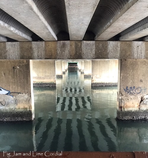 Our route takes us under several bridges, and I’m always intrigued by the play of light on the water. Last week, the City West Link overpass created amazing stripey reflections. I walk under this bridge almost every day…