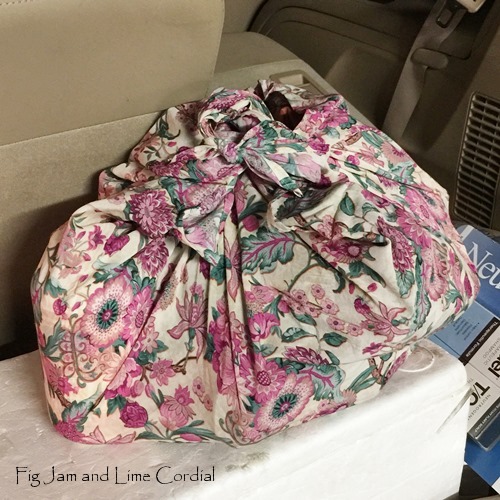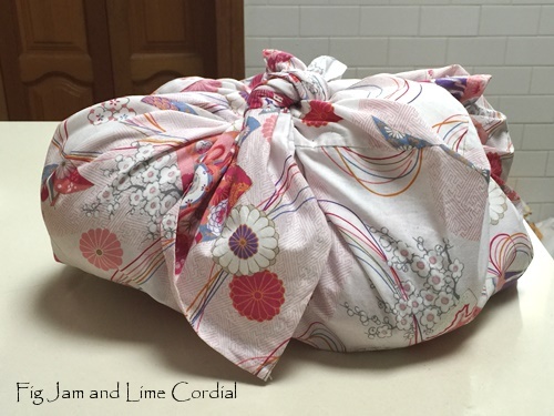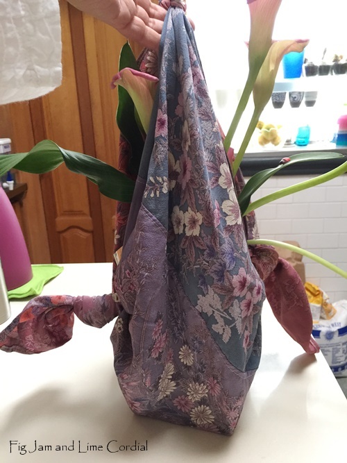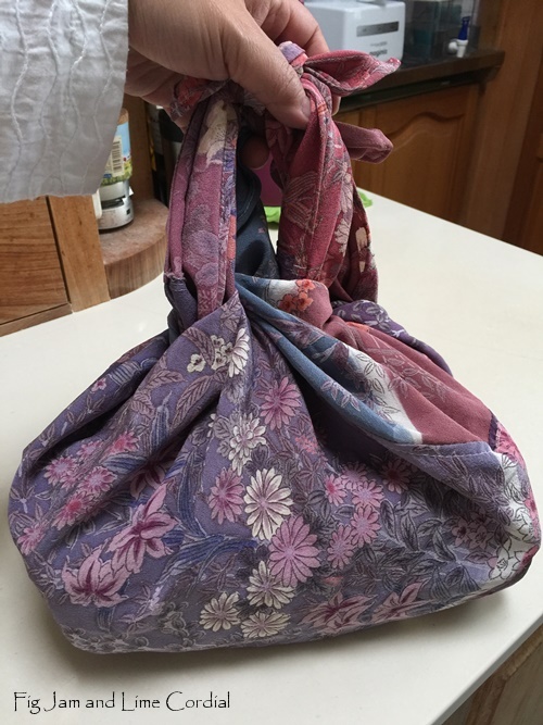 A furoshiki has two advantages over a bag…firstly, it can be untied and thrown into the washing machine, and secondly, it can be folded to specifically suit the item in question. I’ve been making them out of my stunning fabric finds from Cash Palace Emporium.