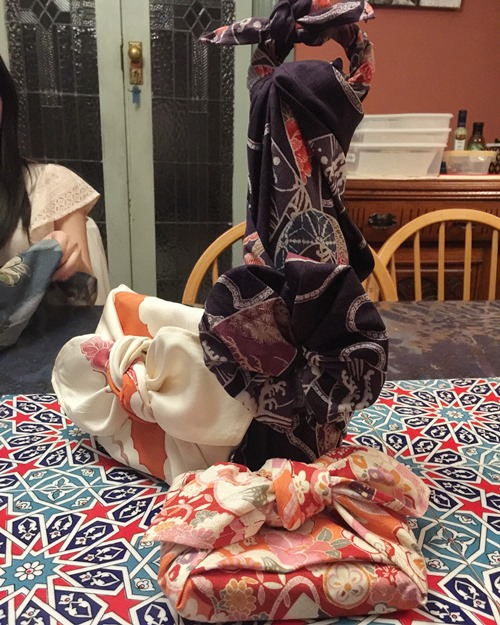 Inspired, I hemmed a basketful of square cloths, declared them to be furoshiki, then proceeded to use them to wrap everything from coats to groceries to iPads to fossils…