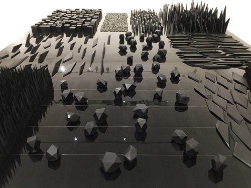 Yang Mushi’s Grinding is a collection of over a thousand hand-hewn, black lacquered wooden blocks. The polished aluminium base makes it difficult to distinguish where each piece ends and its reflection begins…