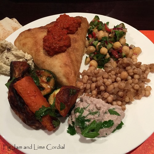 This was one of the most enjoyable vegetarian dinners we’ve ever prepared and with a few minor changes, it could easily have been vegan-friendly. The Moro Cookbook has clear instructions and wonderful flavour combinations. We made fatayer (recipe to follow), chick pea salad, turlu turlu (roast veg ratatouille), walnut sauce and harissa, and accompanied it with Sawsan’s hummus and Barbara’s moghrabieh…