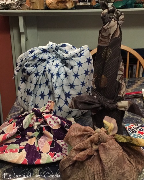 Then lovely Carol offered to host the dinner at her house, where the dishwasher was working perfectly. So Pete and I cooked all day, then wrapped everything up in furoshiki to transport it. Ha! That almost made up for the dishwasher and oven being broken…