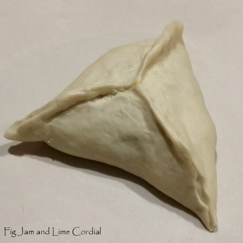 Now here is the only tricky bit – moisten the outside of the circle with water, then fold the edges in to form a triangle. Press the edges tightly together…