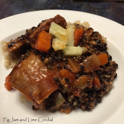 We de-fatted the dish as much as possible, then served it with brown rice and the first of our preserved garden lemons. It was a huge hit with the carnivores…