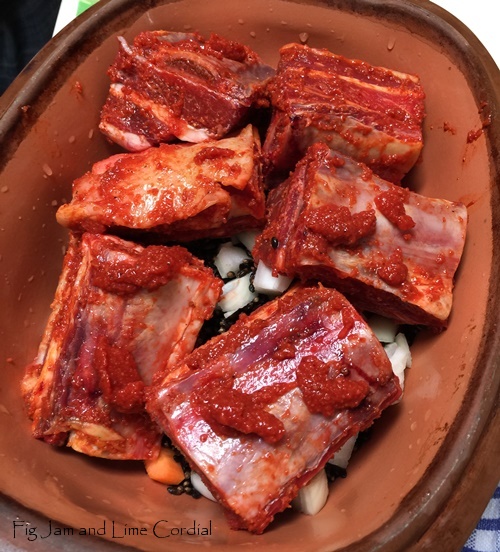 That night, I popped my Römertopf baker into the sink to soak, and smeared a kilo and a half of the ribs with the Portuguese seasoning mix I bought at Charlie’s Deli..