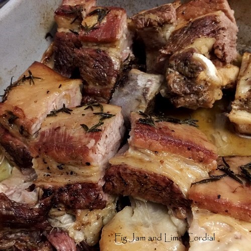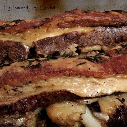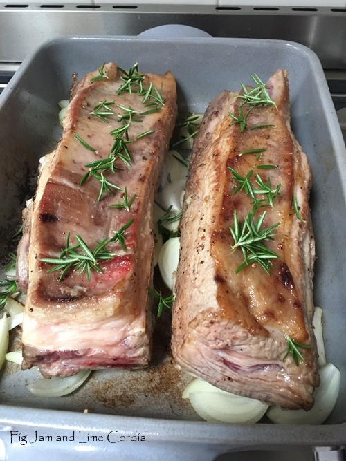 I bought two and gratefully accepted Jose’s offer to cut through the bone at the back, separating it into shorter pieces while leaving the meat intact on top. Inspired by the Mothership brisket recipe in Save with Jamie, these were rubbed with ground black pepper and sea salt, then browned in a little oil on all sides in our (much loved) flameproof Emile Henry roasting pan. Two chopped onions were scattered over the base of the pan, the ribs laid on top, then rosemary leaves were stripped over…