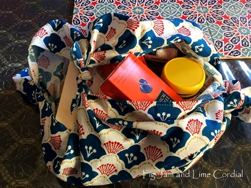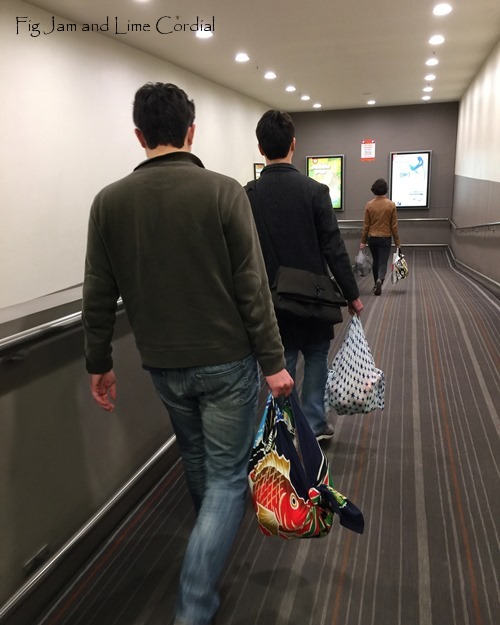 I now keep three thin cotton furoshikis in my handbag at all time, which is usually enough to cart all our groceries home. Let me end with this photo of Big Boy and Small Man carrying our fruit and vegetables to the car a couple of weeks’ ago (I’m indoctrinating them early) – you can see how full the cloths are, yet both boys commented on how easy the furoshikis were to hold. With the large supermarkets now banning plastic bags, there’s never been a better time to revisit this ancient Japanese art!