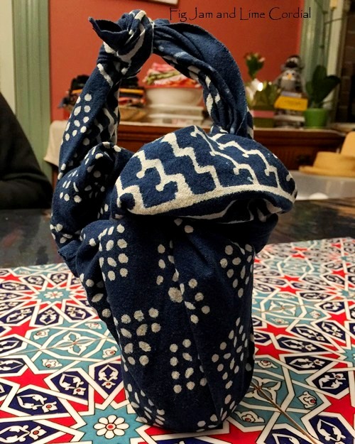 The following evening, the indigo cloth came back wrapped around a six-shot Negroni cocktail in a jar (I love that The Screaming Mongoose unpacked his cocktail shaker before his cutlery)…