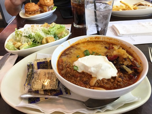After an hour of vigorous exercise (for some, Pete and I mostly sat and watched the kids break out their dance moves), we grabbed a quick bite of lunch at Bibi’s Burgers in Santa Rosa. I had the chili, which was served with Saltine crackers…