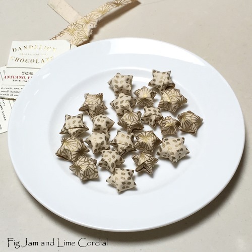 It’s easy to recycle treasured papers as well – these wrappers from the Dandelion Chocolate bars (mentioned in the previous post) were far too pretty to waste, so we steamed off the labels and guillotined them into strips. We still have three bars to eat, but when they’re finished, I should have enough stars to fill a small glass bottle. It will be a perfect holiday souvenir!