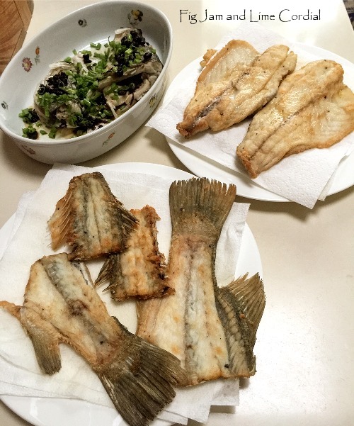 On our last trip to Costco, baby barramundi from Humpty-Doo (it’s a real place, google it!) was discounted by 50%. We brought home two fish, cut off the heads, then filleted them. The four fillets (skin on) and the bones were dusted in seasoned flour and simply pan fried, then I microwaved the heads with black beans and spring onions.