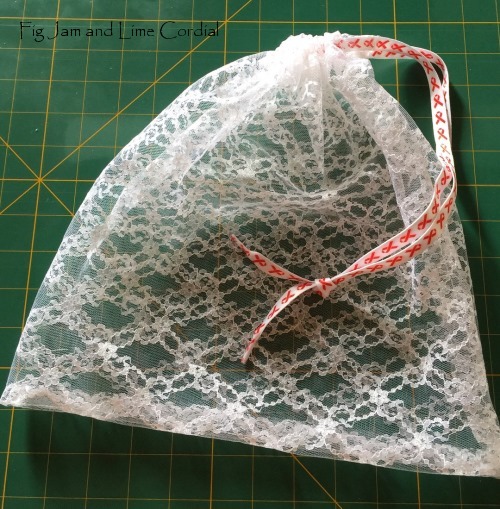 I also found shoelaces in the bag area (where items are priced individually rather than in bulk) which were perfect for drawstrings (they were leftovers from World AIDS Day, hence the red ribbons). These mesh bags for fruit and vegetables were quick and easy to sew and cost me less than 20c each…