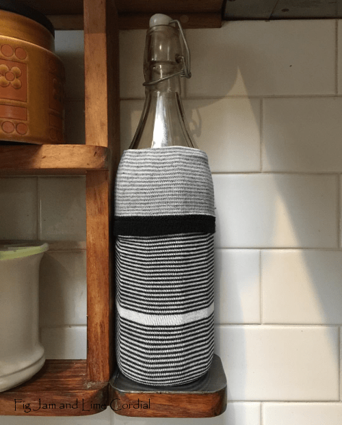 Lori, since taking that photo, I’ve cut the bottom off the sock and just left a sleeve around where the neck of the bottle widens- I find it easier to grip the bottle that way as the stripey socks are quite smooth and a bit slippery. I don’t think it would be a problem with a chunkier sock.