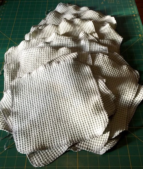 And if it all sounds too hard, you could just sew some dishcloths. I found an old piece of cotton waffle weave fabric in my stash – I think it was for bedspreads, but we’d used it as an outdoor table cloth at the kids’ birthday parties. I simply cut it into squares and overlocked (serged) the edges. They work a treat…