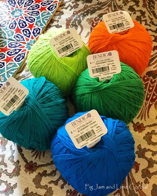Given that I can make ten dishcloths from each 200g ball, I probably didn’t need to order five, but I found the colours irresistible. Bendigo Mills import their raw cotton from Asia (you know me, I rang to ask!) but they process it all in Victoria. Their wool, on the other hand, is locally grown in central NSW.