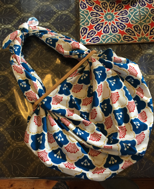 I don’t take shopping bags anymore as the cloths live permanently in my handbag. They’re surprisingly strong and can hold up to twice as much as a regular plastic shopping bag. At home, we use them to wrap everything from lunch boxes to excess linen to loaves of bread. A couple of my furoshiki have even become fashion accessories, thanks to these snazzy magnetic handles that Kevin and Carol bought me in Japan…