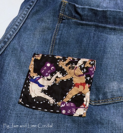 what a great new hobby – looks like you are having heaps of fun – I think you should wear your denim ponch out on your walk to remind you of what you get instead of the coffee :-) those are some fancy patches too – love the sumos on the bottom – this is a video I really love with patching – https://www.facebook.com/brightside/videos/jean-hacks/1396314110511170/