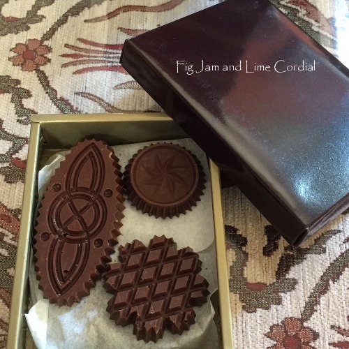 Let me show you what I mean. I made feuilletine chocolates…and packaged them in cardboard boxes that I’d found in the bag area at Reverse Garbage (industrial surplus)…
