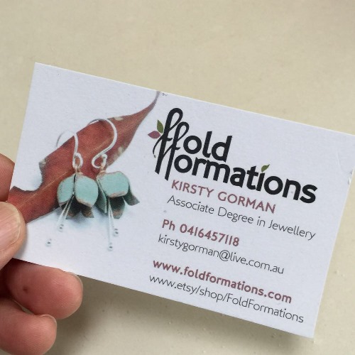 Kirsty Gorman makes her jewellery entirely from reclaimed materials – even the hooks are recycled sterling silver. The fuschias were carefully crafted from rescued bathroom copper, anodized to create different hues and then trimmed, shaped and assembled. Best of all, they tinkle when I shake my head…