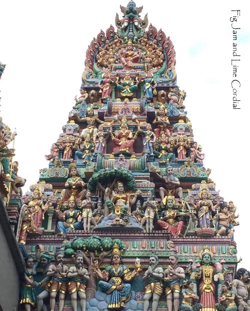 The Sri Veeramakaliamman Temple (Hindu) was hard to photograph against the bright sky, but it was wonderful in person. I walked past it in Little India…