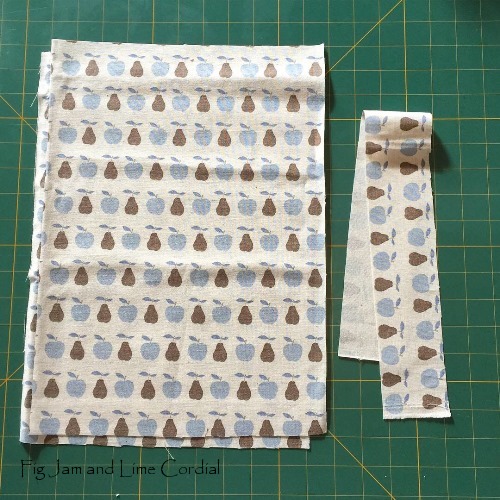 Start with two rectangles of fabric – approximately 15″ x 11″ (38cm x 28cm). Also, cut a strap 2½” (6½cm) wide by whatever length you prefer. My handles all ended up different lengths, determined by whatever scrap I was using…