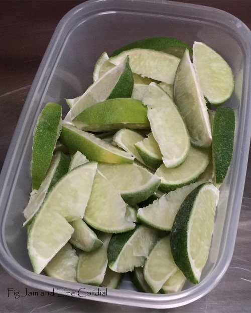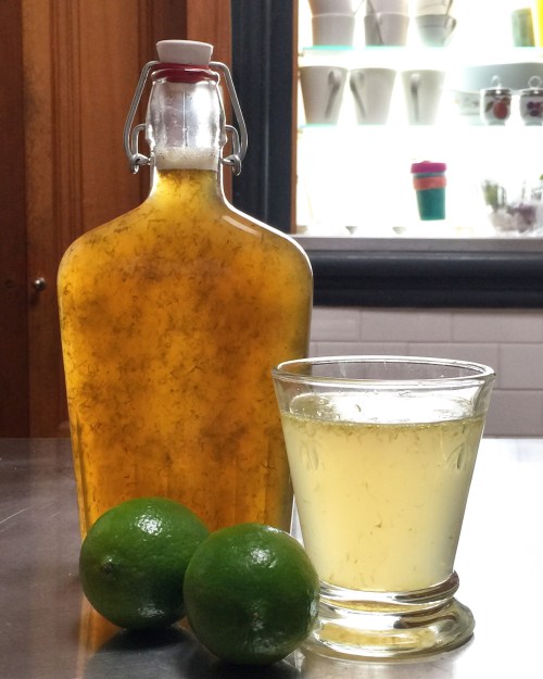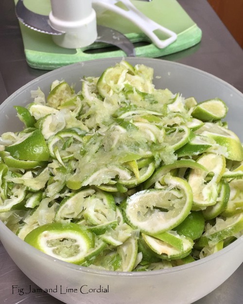 Today, I whipped up a batch of Linda Woodrow’s brilliant lime cordial. The recipe is here, and my take on it uses eight limes, a cup of water and 1¾ cups of raw sugar. I stash it in the fridge and serve it with soda water…