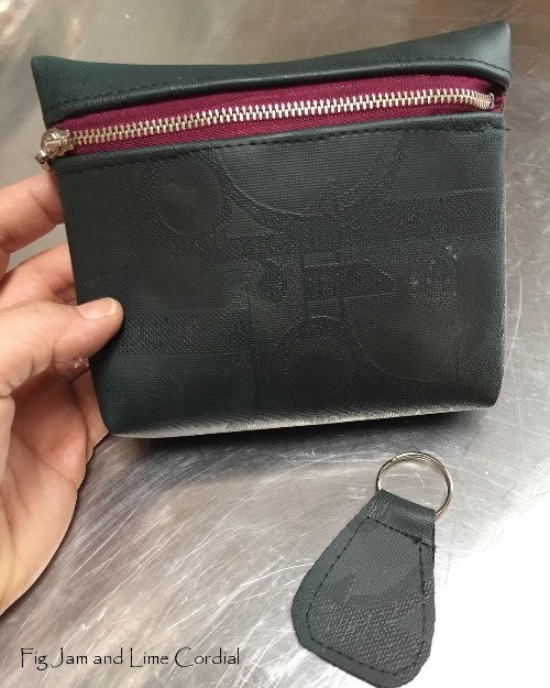 Last week, inspired by all the amazing work Elvis and Kresse do, I cut the bag up and turned part of it into a small zippered pouch. A section from the base became a key fob. It was hard going and I’m incredibly grateful for my industrial sewing machine…