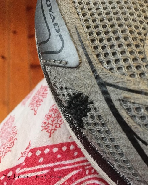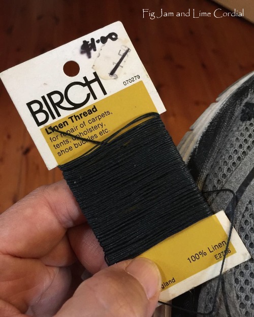 Small Man’s runners were still in good shape after a couple of years of daily use (he’s an elf, remember), but he caught the side of one shoe on a nail recently. It was easy to darn the hole with strong linen upholstery thread that I found while tidying up…
