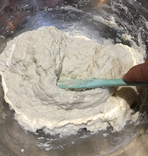 1. The night before: combine all the ingredients except the semolina in a large wide mixing bowl. Stir them together with a silicon spatula until all the dry ingredients are incorporated and you’re left with a shaggy dough. Cover and leave to rest for an hour.