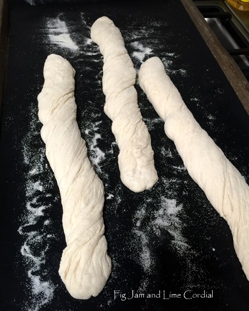 6. Starting in the middle of each log, gently twist the dough – first to one end, then to the other. Cover the shaped dough with clean tea towels and let them prove briefly while the oven heats up.