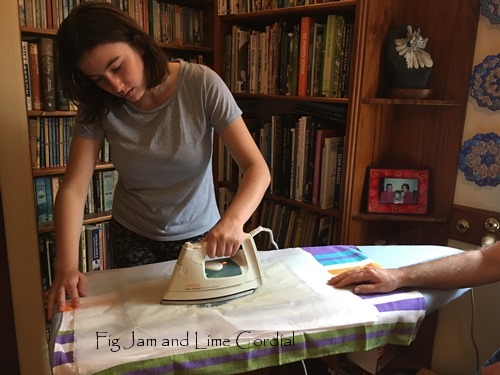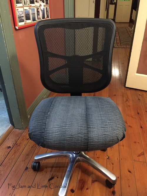 We put my sewing machines to good use and mended Cake’s vintage chenille bedspread and hemmed Ilaria’s too short dress into a top. Pete and I used a pair of old jeans to reupholster Bernie’s office chair…