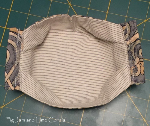 4. I added a small pleat at the bottom of the mask so that it would sit more snuggly around the chin. You can see a bit more detail in the photo below – the mask is upside down and you’re looking at the inside of it…