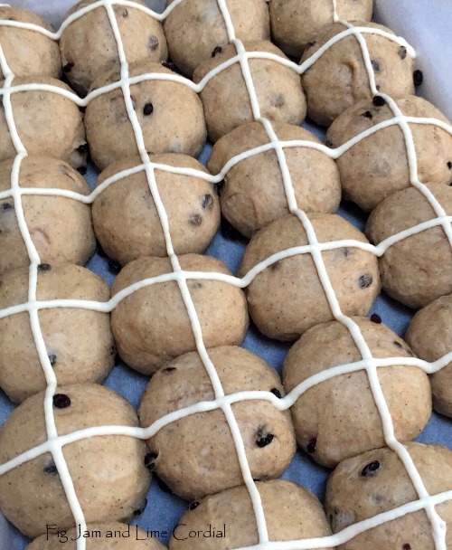 2. The true secret here (ok, apart from the extra butter) is patience. For a yeasted dough, this takes a very long time to rise. Let the first bulk prove and get properly puffy before you shape it, and then let the shaped buns rise and rise. They need to be fat and a bit squishy and touching each other before you pipe and bake them. My second rise (and our weather is a bit cooler at Easter) usually takes a good hour to an hour and a half…