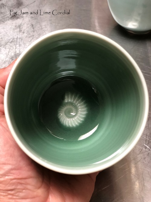 Each has a wee ammonite – my wee ammonite – in the base. The one I’m using most often has a green celadon glaze and fits perfectly in my hands…