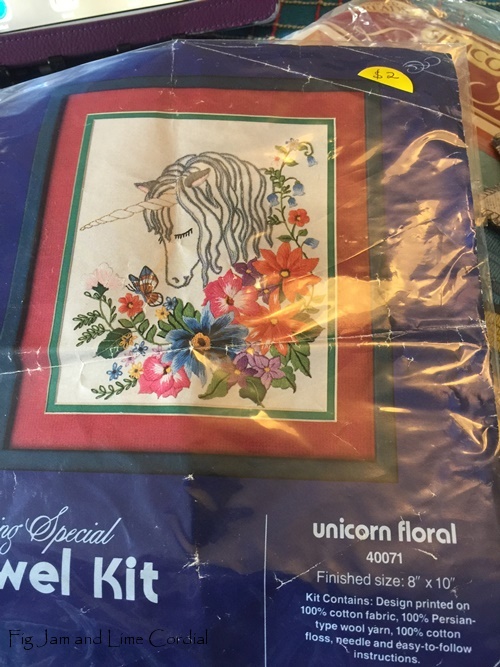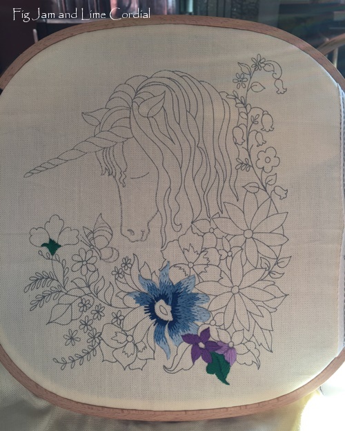 I’m still working on the unicorn, but I did manage to finish this small piece. The kit was $1, the hoop to work it on was $2, and the frame was another $1. I pay more than that for coffee. And it was definitely worth $4 to learn that I don’t love French knots…