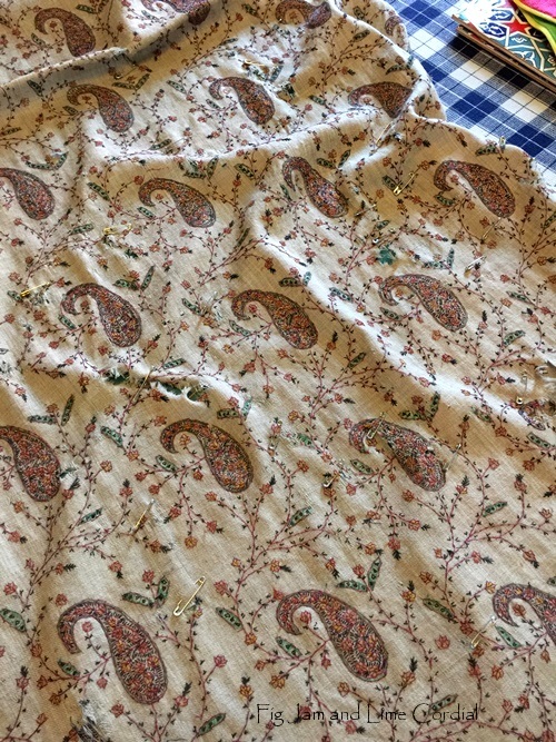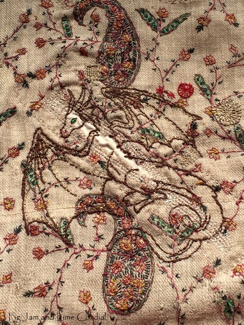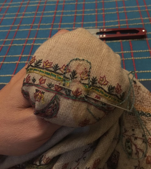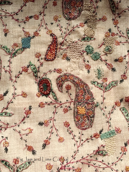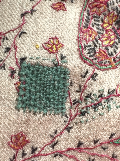 Thankfully, lovely Elaine at Cash Palace Emporium is as unable to walk away from vintage textiles as I am. Although even she was fooled this time, as this beautiful 80 year old pure wool shawl of fine Kashmiri embroidery was folded into a tiny package with only an undamaged portion showing. When she got home and opened it up, there were more than a hundred holes in it, some of them several inches across, and a couple large enough to put a hand through. I bought the piece from her atΒ Rozelle Markets for $10 (and only because I insisted on paying something for it – she wanted to give it to me for free). I brought it home and gently washed it by hand and hung it out to dry.