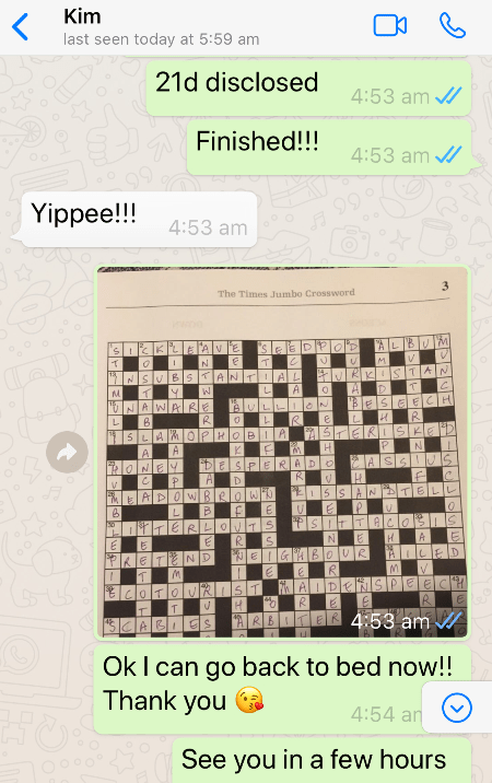 So today, I’m feeling incredibly grateful for technology that lets me share a crossword with a faraway friend via my mobile phone.Thank you, lovely Kim, for helping to keep me sane during isolation! And for knowing all the answers to the hard clues!