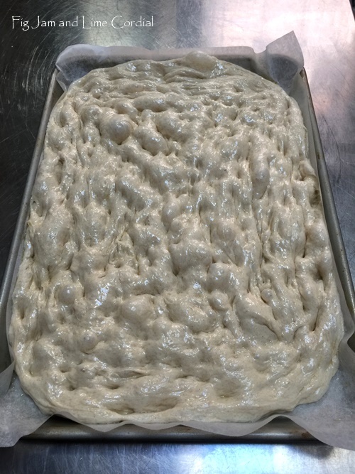 3. Line a baking tray with parchment paper and scrape the dough onto it. Oil your hands and gently flatten the dough into a rectangle. You will probably need to get your fingers under the corners and give it a gentle pull to get it into shape. My pan was 40cm x 28cm.